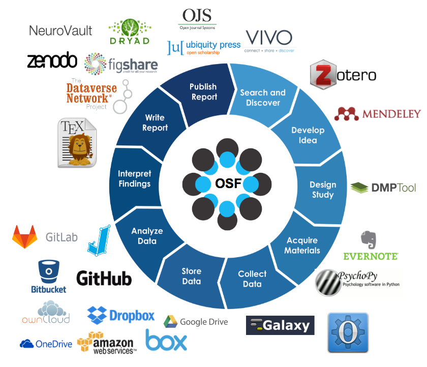 As we learned in What is an Open Workflow?, a workflow can include many different tools and application across the lifespan of the research project. For example, if we review the OSF Research Life Cycle image (below) we can see that one research project could include the use of Zotero, DMP Tools, Evernote, GitHub, Zenodo, and more depending on the stages of the project.