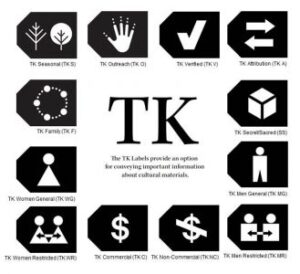 The TK Labels are a tool for Indigenous communities to add existing local protocols for access and use to recorded cultural heritage that is digitally circulating outside community contexts. The TK Labels help non-community users of this cultural heritage understand its importance and significance to the communities from where it derives and continues to have meaning.[3]