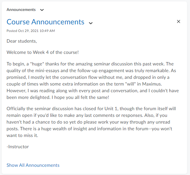Here is a real world excerpt from a course announcement signalling the instructor’s interest in a previous week’s forum discussion.