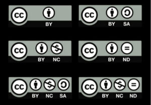 - CC BY:他の人はあなたが作品の制作者であると明記すれば、営利目的であっても複製、頒布、展示、実演することができます。これは最も利用されているライセンスです。素材を最大限に普及させ、利用する場合に対して推奨されます。