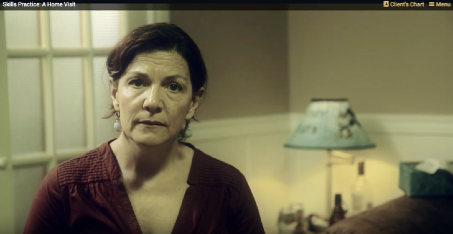 Video Game Simulation:  A Home Visit game promotes the application of knowledge and skills related to establishing a therapeutic nurse-client relationship and completing a mental health assessment. Students assume the role of a community health nurse assigned to complete a home visit. Video is used to create an authentic experience, and students have to respond to particularly challenging situations, based on procedures taught elsewhere in the course. Depending on the student response, further video segments are used to provide feedback and to continue to scenarios to test the next appropriate procedure.
