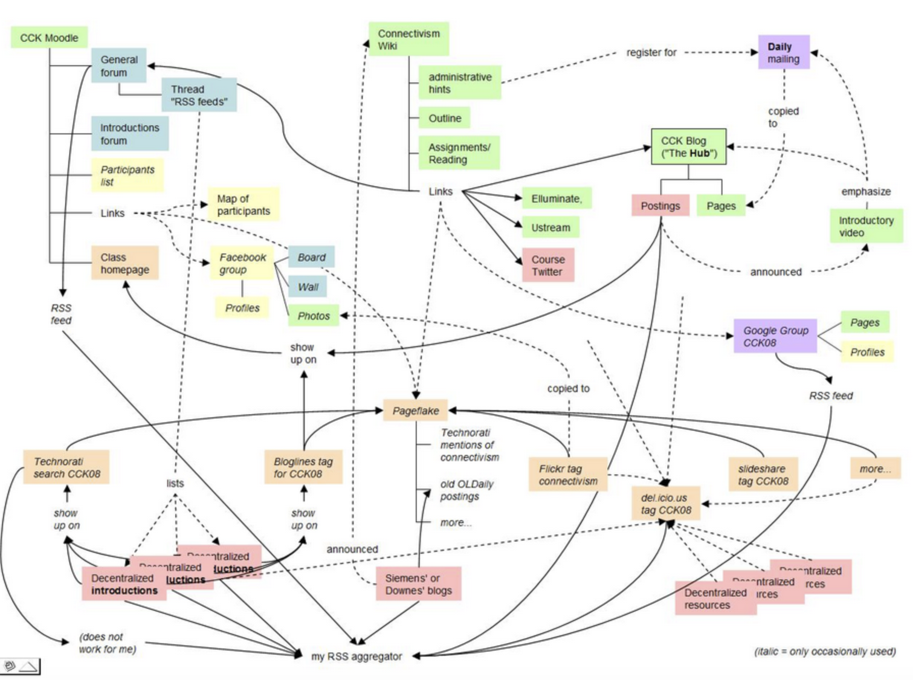 - distributed communication This is probably the most difficult design practice to understand for those not familiar with cMOOCs – and even for those who have participated. With participants numbering in the hundreds or even thousands, each contributing individually through a variety of social media, there are a myriad different inter-connections between participants that are impossible to track (in total) by any single participant. This results in many sub-conversations, more commonly at a binary level of two people communicating with each other than an integrated group discussion, although all conversations are ‘open’ and all other participants are able to contribute to a conversation if they know it exists. The key design practice then with regard to communication is a self-organising network with many sub-components;